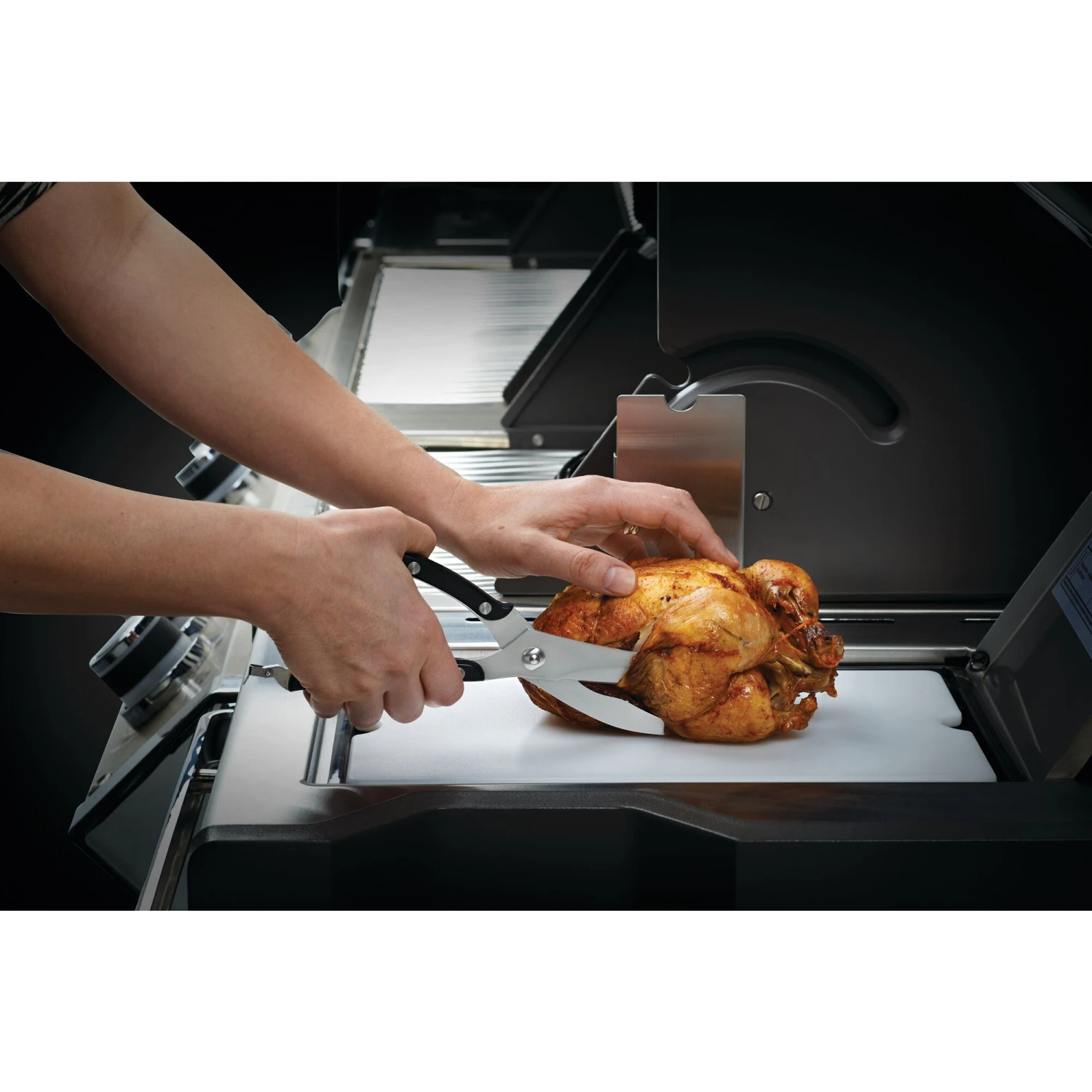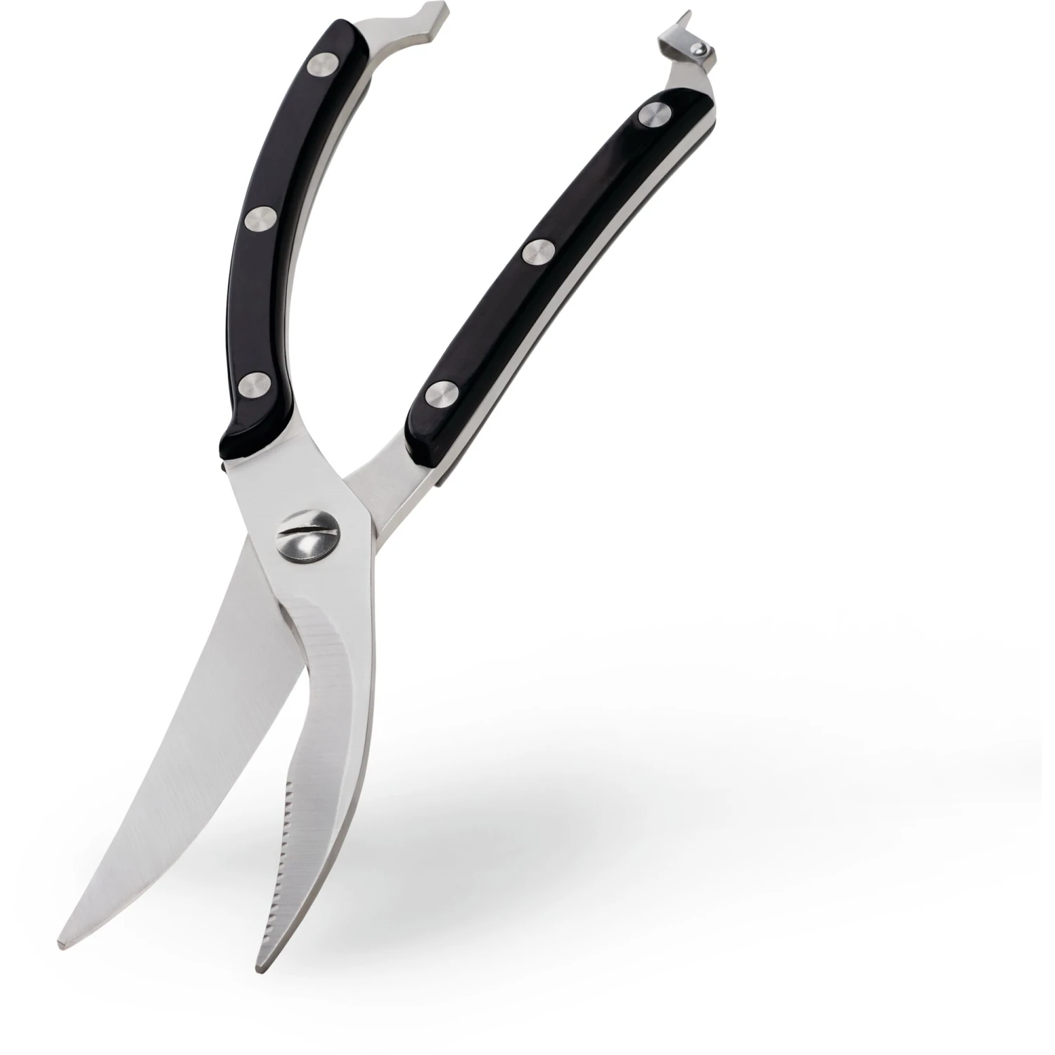 A must-have tool for serious grilling masters, the PRO Poultry Shears by Napoleon are built to easily cut through poultry, ribs, crab and other tough meats and bone. Easy to use, these shears have spring tension for improved control and comfort while in use. A fully stainless steel tang and blades make sure that these shears will stand up to whatever you can throw at them. The handles are riveted and provide a comfortable left or right-handed grip. A Safety latch on the handles ensures the blades stay locked closed when not in use. For best performance, we recommend that you wash these Professional Poultry Shears by hand. Efficient food prep is within your grasp with these Professional Poultry Shears.